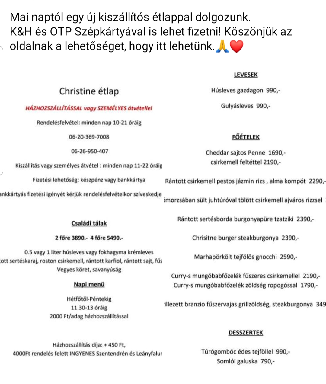 A kialakult helyzet miatt ingyenes a házhoz szállítás Szentendrén és Leányfalun étlap alapján, vagy hétköznaponként van lehetőség menüre is 2000Ft/adag áron.